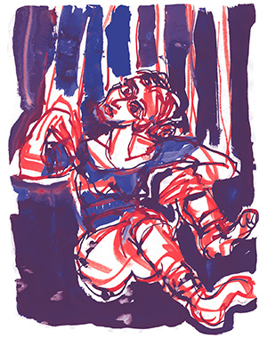 Un processus d’interaction intense se joue entre nous. La peinture que j’applique prend corps en direct. Mes gestes de peintre, tout ce que je dessine, composent autant de saisies du réel qui font de moi un anthropologue « mimeur » ; un « cinémimeur » qui se joue du réel. Nos pratiques artistiques, ici réunies, ne sont pas de simples « en face » du peintre. Ce sont avant tout des rencontres riches et précieuses parce qu’elles déplacent les lignes, elles retournent le sens des interrogations sur les représentations de l’espace chorégraphique et sur le geste. Le chemin, c’est la présence, l’interprétation, autour desquelles ma peinture articule son chemin. C’est un chemin plastique mais aussi de « vérité ». Il faut le dire. C’est-à-dire une éthique du sens de l’existence en général. C’est fondamental. « Éthique » ne veut pas dire ici « morale » mais signale et accompagne une interrogation de ce qui vaut la peine. Elle dégage l’horizon d’une certaine plénitude du vivre. Peindre, c’est vivre.
