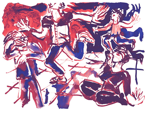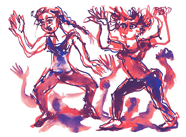 Alors on cherche en dansant parfois, en chantonnant aussi, en guettant quelques vrais dialogues qui seraient restés cachés, vestiges de formes d’autrefois, à quoi s’accrocher un peu.