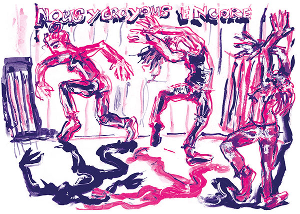 Pour moi, « Jusqu’au soir » n’est pas une image négative comme une absence de couleurs, mais bien, ainsi que le dit Soulages de son « outrenoir », « la réflexion de la lumière sur les états de surface de cette couleur noire ». Voici donc ce que je peux lire du travail de Charlotte : un « outrenoir » de Soulages. La musique, les lumières, les corps réfléchissent.