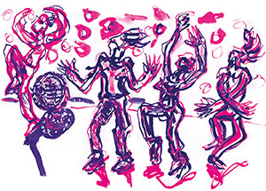 Côté cour, ou si vous préférez à droite, Patrick dessine furieusement sur ces grandes pages blanches ; côté jardin, au lointain ou si vous préférez à gauche et au fond du plateau, Charlotte crie en Looper…