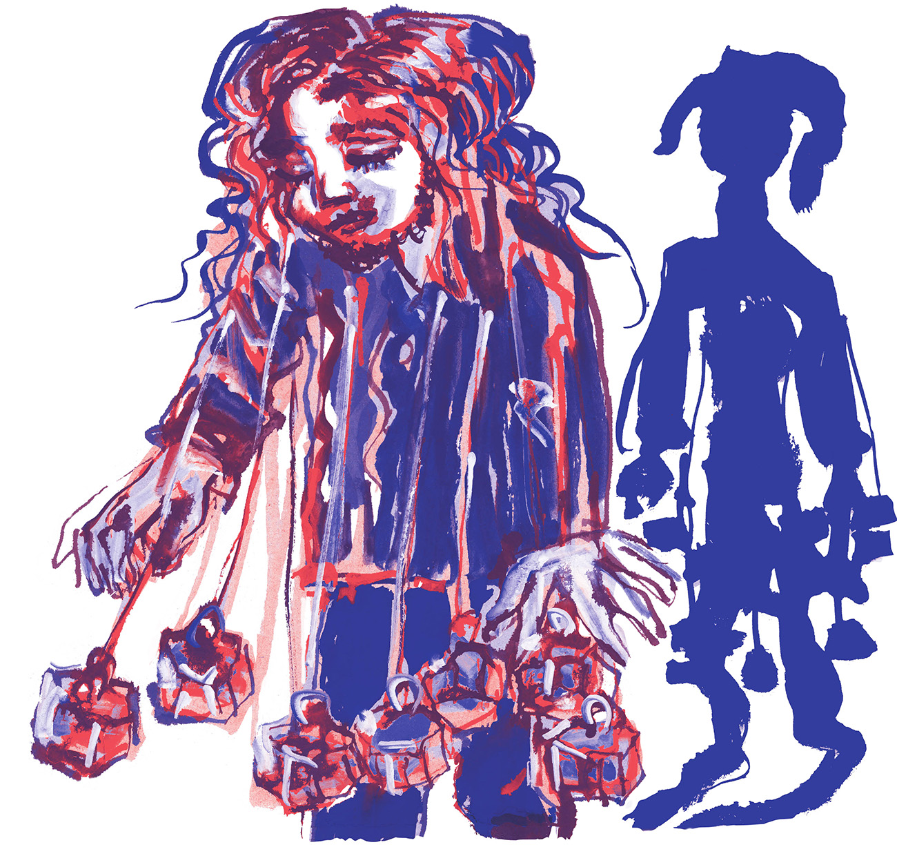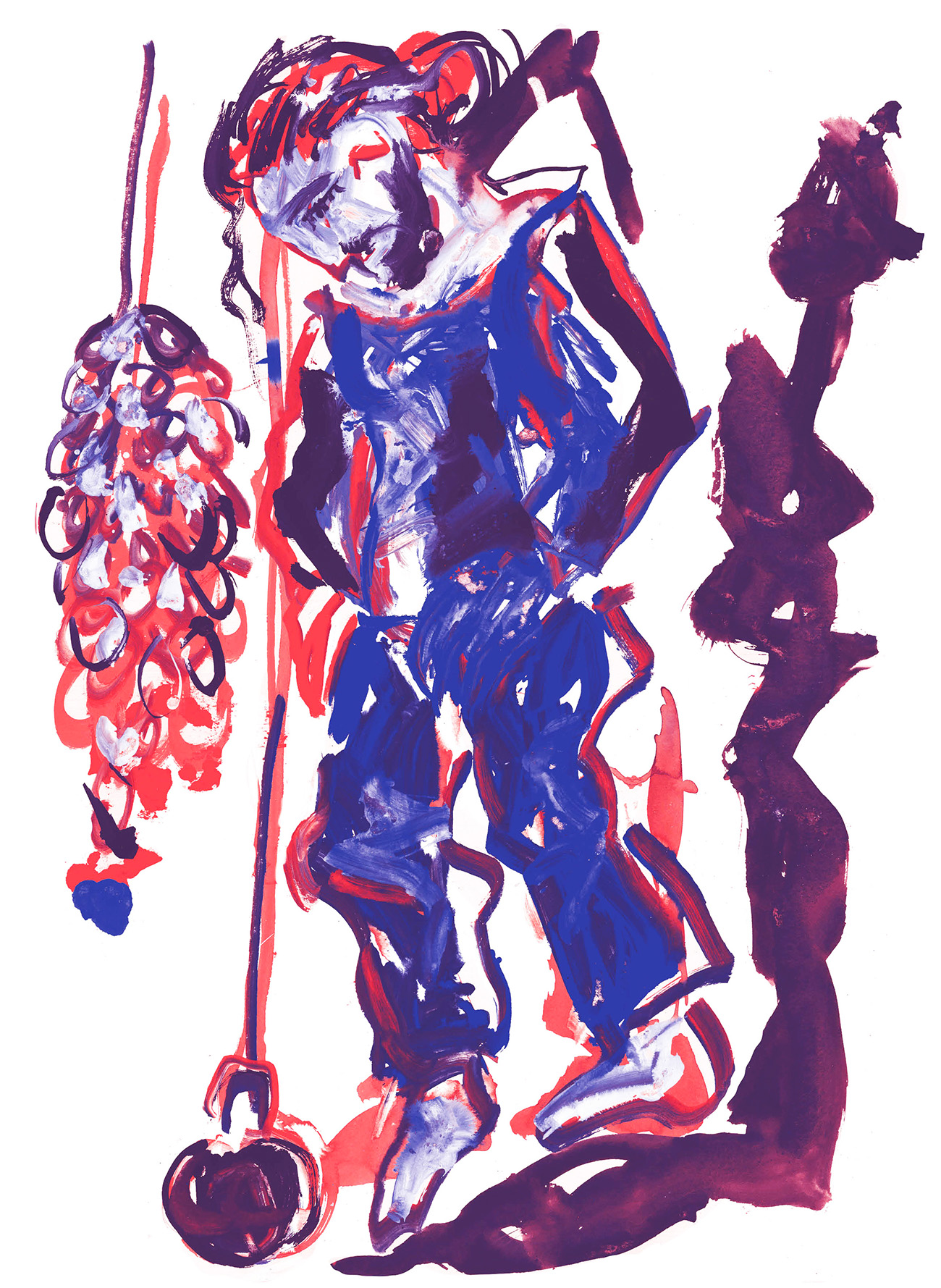 Autour de lui, un sombre bric-à-brac et des élastiques munis de harnais qui tombent des cintres, mais rien pour les cheveux. Ou alors les cheveux d’un géant.