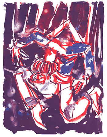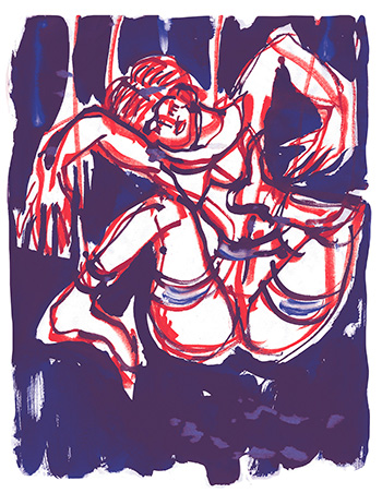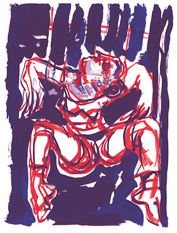 Mes peintures se créent sur le vif. Sur le vif des répétitions, des restitutions des 33 compagnies invitées au Théâtre de Val- de-Reuil. Je dérègle du jeu dans la peinture, à jeux ouverts. La partie n’est pas jouée. Ce sont des peintures en scène des expériences pensées par les gestes chorégraphiques, aussi bien que par les mots de l’écrivaine Marie Nimier qui a pris en charge la musicalité de l’écriture de ce journal. Liées à ses mots, mes peintures sont des incorporations des gestes chorégraphiques inventés tout au long de ce temps bouleversant que nous traversons aux aguets, toutes et tous ensemble. Ce temps se poursuit, jusqu’à quand ? Jusqu’à l’épuisement ? Nul ne sait. Ce temps engage l’invention aussi bien que notre résistance créative.