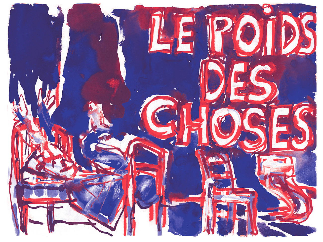 Le poids des choses, c’est le titre du spectacle, alors des haltères, oui, ça tombe sous le sens, comme tombent les lettres qui brillent sur le rideau, en fond de scène, pendant l’entrée du public. Une par une, dans un bruit de ferraille, elles se détachent. Le noir se propage, le décor s’anime. Lit, balances, tables et chaises vivent la vie des objets — de ceux, pour citer le poète Claude Royet-Journoud, qui contiennent l’infini.