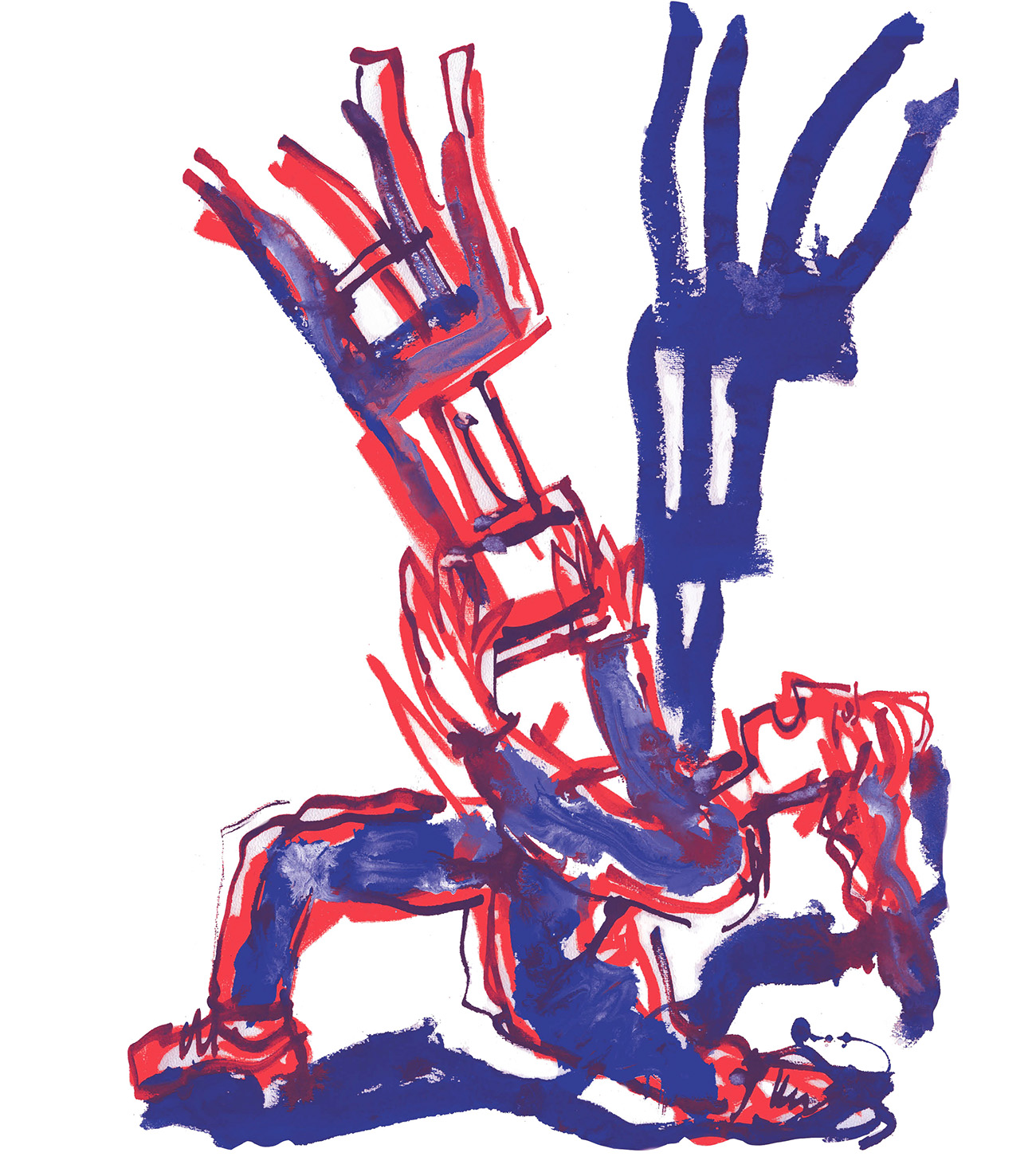 Autour de lui, un sombre bric-à-brac et des élastiques munis de harnais qui tombent des cintres, mais rien pour les cheveux. Ou alors les cheveux d’un géant.