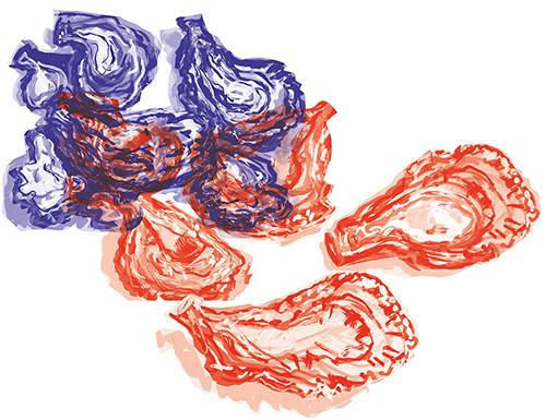 Ohhh huître, mollusque bivalve. Aucune détermination précise ne te projette vers une destinée mâle ou femelle, homme ou femme. Quel dieu, quelle déesse, t'a inventée ? Hermès ? Aphrodite ? Les deux ? Tu réveilles en nous nos instincts les plus voluptueux !! Toi, petit muscle pathétique, je veux te voir ! Je te désire ! Comment faire pour trouver l'accès à ta chair, à ton trésor caché ? Comment t'ouvrir ? ....Parle, parle, parle ! Du bist stumm wie ein Fisch, obstinée, tu restes accrochée à ton rocher comme La Lorelei sur le Rhin, mais toi, tu ne chantes pas ! Tu restes muette, emmurée dans ton jus salé. Pour qui te prends-tu ?